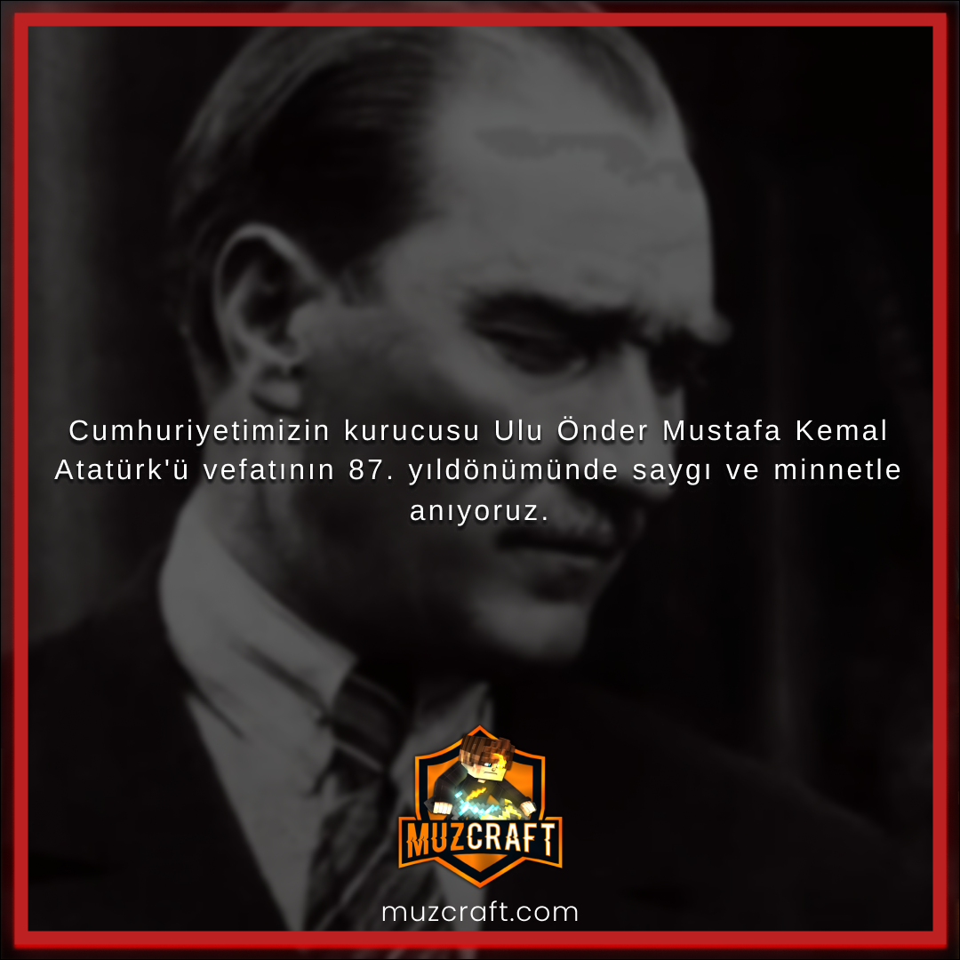 Cumhuriyetimizin kurucusu Ulu Önder Mustafa Kemal Atatürk'ü vefatının 87. yıldönümünde saygı ve minnetle anıyoruz.