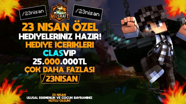 Sizlere 23 Nisan için hazırladığımız harika hediyeleri Minecraft sunucumuz MuzCraft içerisinden içerisinden /23nisan yazarak edinebilirsiniz.23 Nisan Ulusal Eğemenlik ve Çocuk Bayramınız Kutlu Olsun!Türk Minecraft Ser...